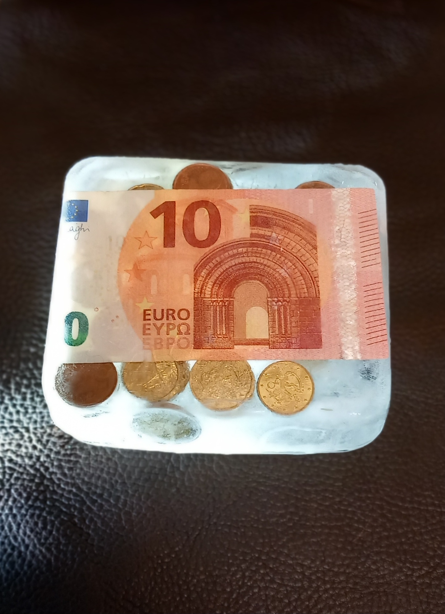 Työttömän jäädytetyt varat, 2025, L 10,5 cm, P 13,0 cm, S 5,5 cm, materiaali: jää, raha